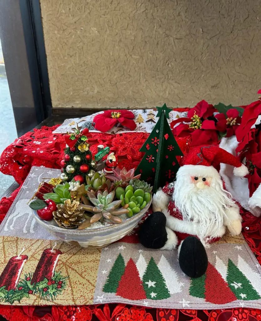 東根市の就労継続支援施設こすもすの家さんで作ってくださる多肉植物の寄せ植えもクリスマス仕様。とってもゴージャスですね。