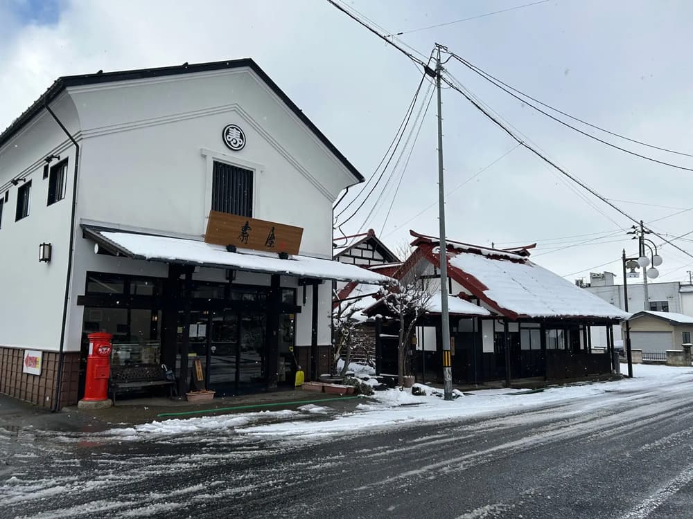 過ごしやすいお正月です。 投稿日: 2026年1月4日2026年1月5日 投稿者: webmaster 昨日の青空から一変して、真っ白な雪景色となった今朝の壽屋前の様子です。 とはいえ、除雪が入るほどの積もり具合でもなく。 午前中、ちょっと吹雪いた時間もありましたが、午後3時現在、青空ものぞき、路面の雪もすっかり融けてきました。 今年は過ごしやすいお正月です。 壽屋隣りの古民家「野守の宿」です。 やっぱり古民家は雪景色が似合います。 この時間はすっかり融けてしまいましたが・・・。 年末にいただいた啓翁桜。 見事に花開いてきました。 お正月を彩ってくれています。 よこおともえ記
