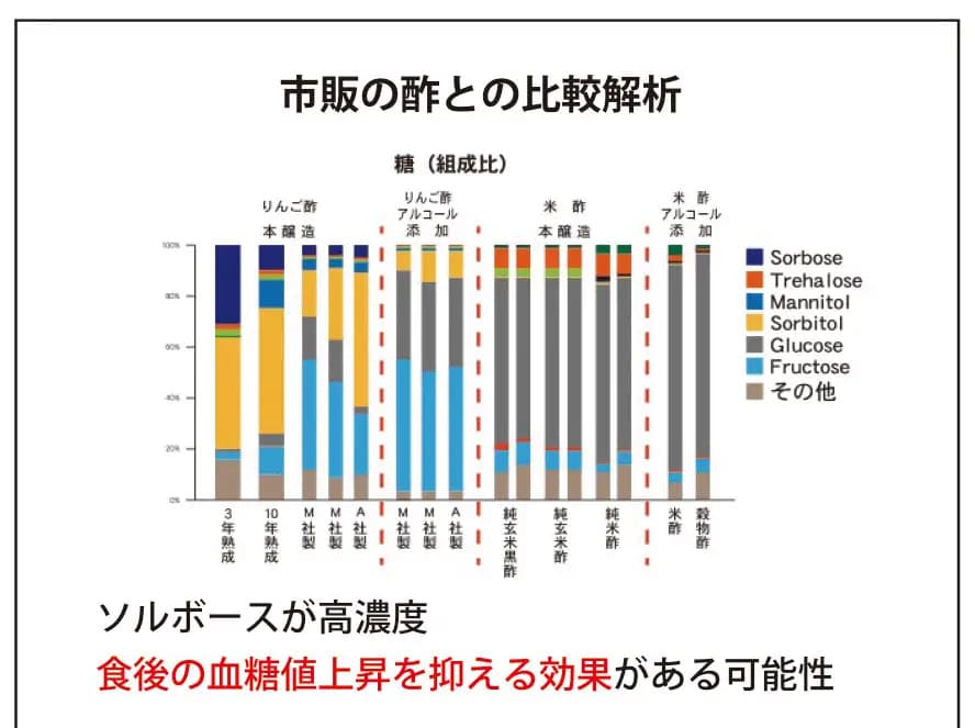 慶應義塾大学先端生命科学研究所と山形県工業技術センター食品醸造技術部、有限会社壽屋漬物道場とで、「りんご酢を科学的に分析プロジェクト」と題し、行った共同研究によりますと、市販の酢と比較して、壽屋のりんご酢は、「ソルボース」という物質が非常に高濃度であることが判明しました。