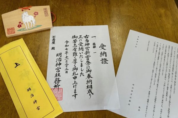 毎年、壽屋では、茜姫を明治神宮の新嘗祭に奉納させていただいております。 今年もその受納書が届きました[…]