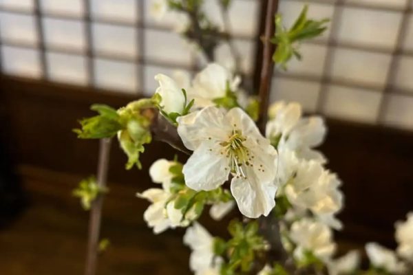 壽屋となりの古民家「野守の宿」の前庭の梅の花が一輪咲きました! 春が進んでいます。