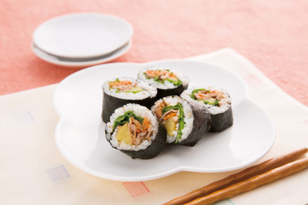 【作り方】 本格醸造りんご酢に塩と砂糖、いりゴマ少々を入れ、酢飯を作る。巻き簾の上に、のり、サンチュ[…]